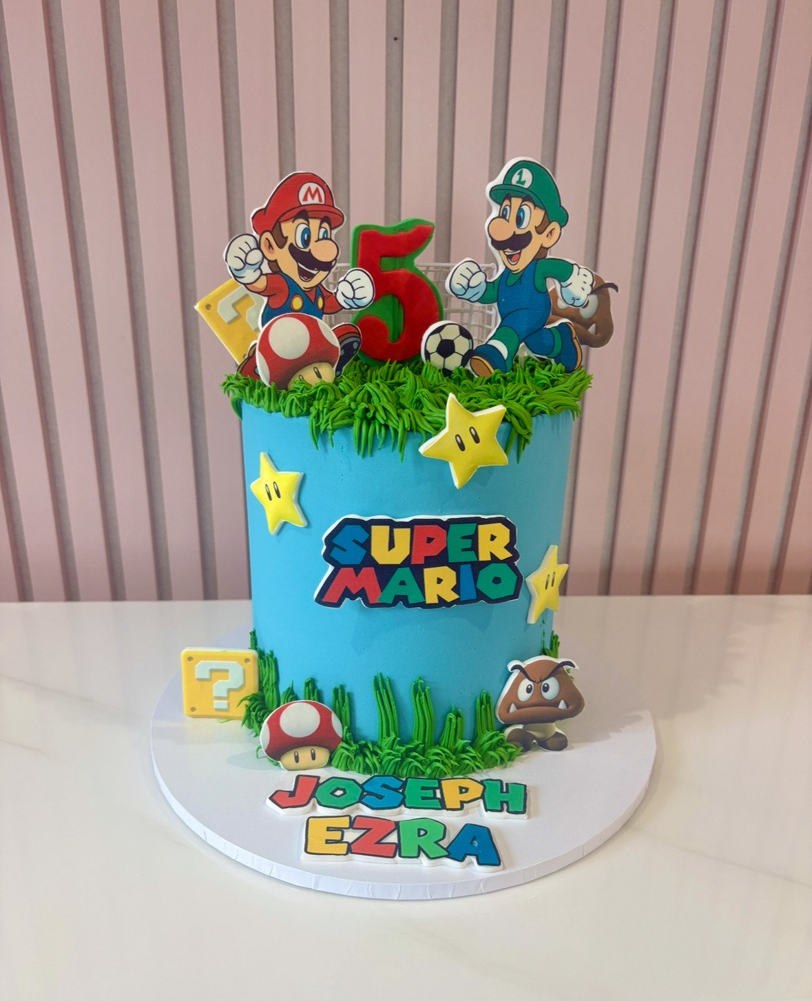 A bright and playful Super Mario themed cake featuring Mario and Luigi mid-action, surrounded by iconic game elements including stars, mushrooms, question blocks and a Goomba. The vibrant blue finish is topped with piped green “grass” detailing and a bold number centrepiece, creating a fun, energetic design that instantly brings the world of Super Mario to life. Perfect for young gamers who love adventure, colour and classic characters.