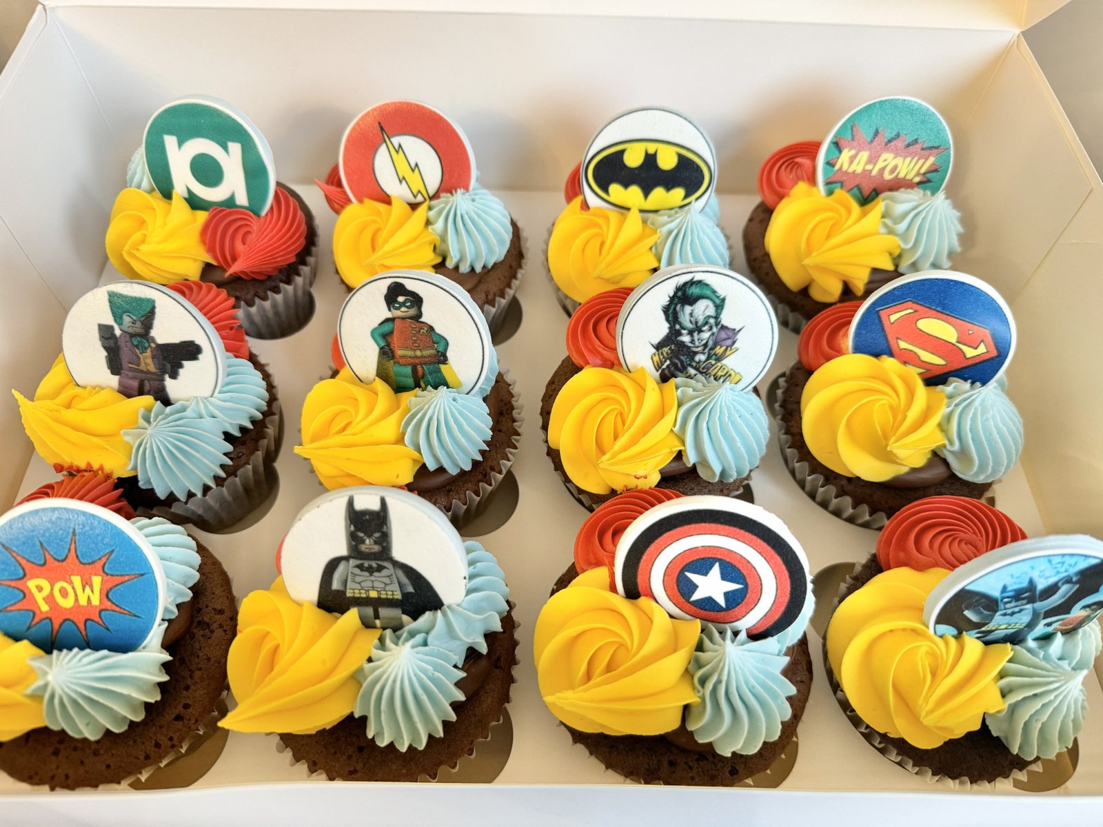 A striking box of superhero-themed cupcakes decorated with vibrant buttercream swirls in bold primary colours and finished with edible character discs and comic-style details. Featuring instantly recognisable superhero icons and designs, these cupcakes are presented exactly as seen, creating a fun, high-impact centrepiece for celebrations and parties.