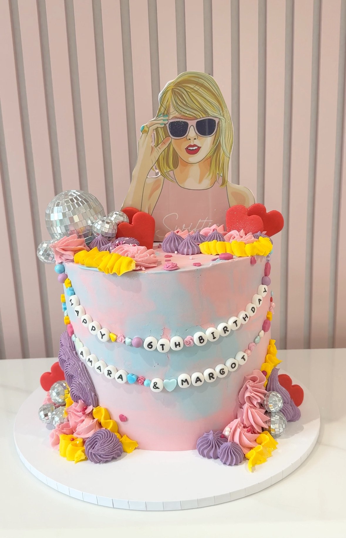 This vibrant Taylor Swift–inspired cake is a bold, fun design perfect for celebrating a Swiftie in style. Finished in dreamy pastel blends of pink and blue, the cake is decorated with colourful buttercream swirls, heart details, and disco ball accents for a playful, party-ready feel. A striking topper inspired by Taylor Swift creates an eye-catching focal point, while personalised bead-style lettering adds a nostalgic friendship bracelet touch. Bright, energetic, and full of personality, this cake is perfect for music lovers and unforgettable birthday celebrations.