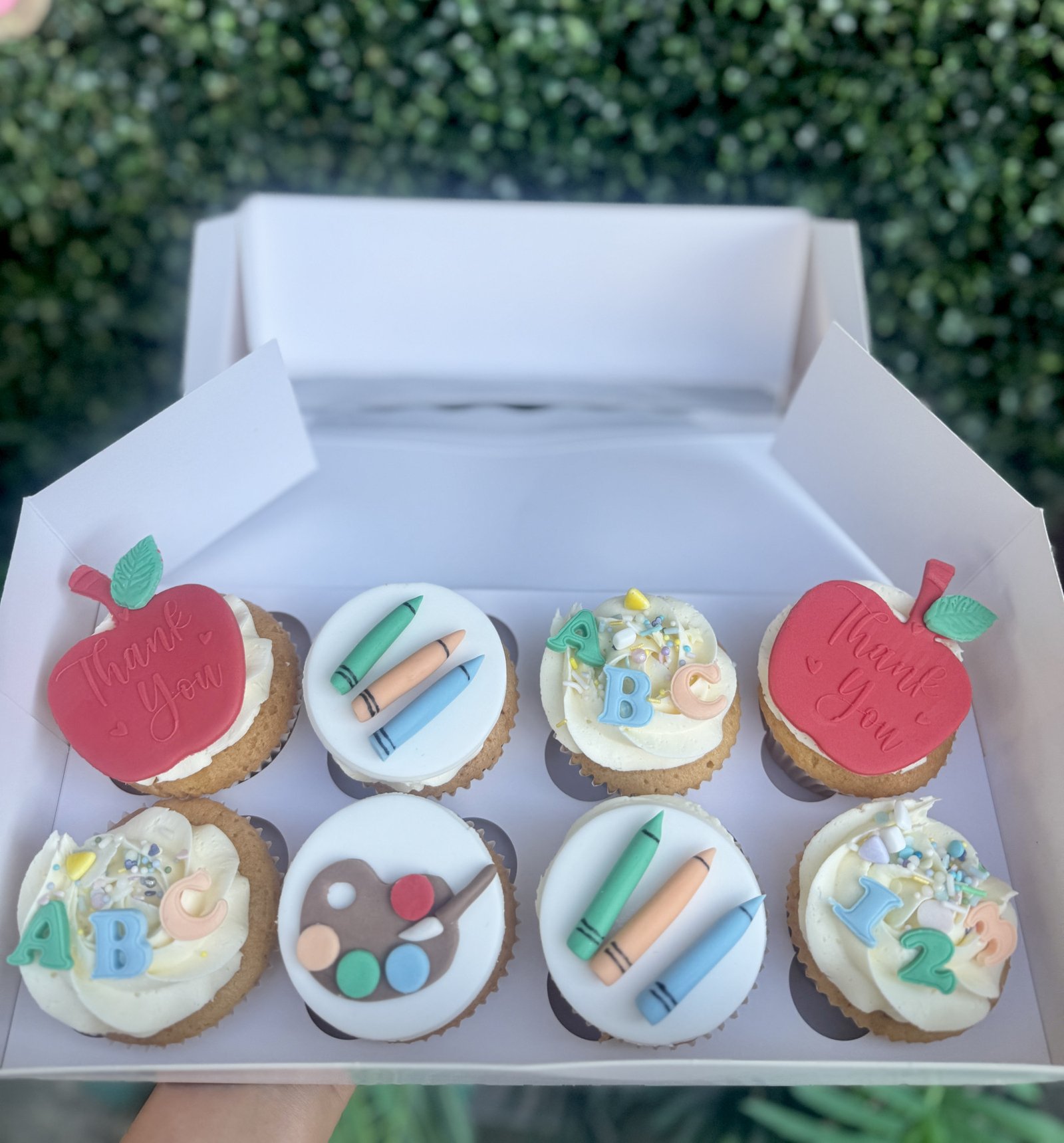 These cheerful school-themed cupcakes are decorated with playful fondant details including apples, crayons, paint palettes and alphabet accents, finished with soft buttercream and colourful sprinkles. Designed as a thoughtful way to say thank you, they’re ideal for teachers, teaching assistants or end-of-term gifts, offering a fun yet beautifully finished treat that feels both personal and celebratory.