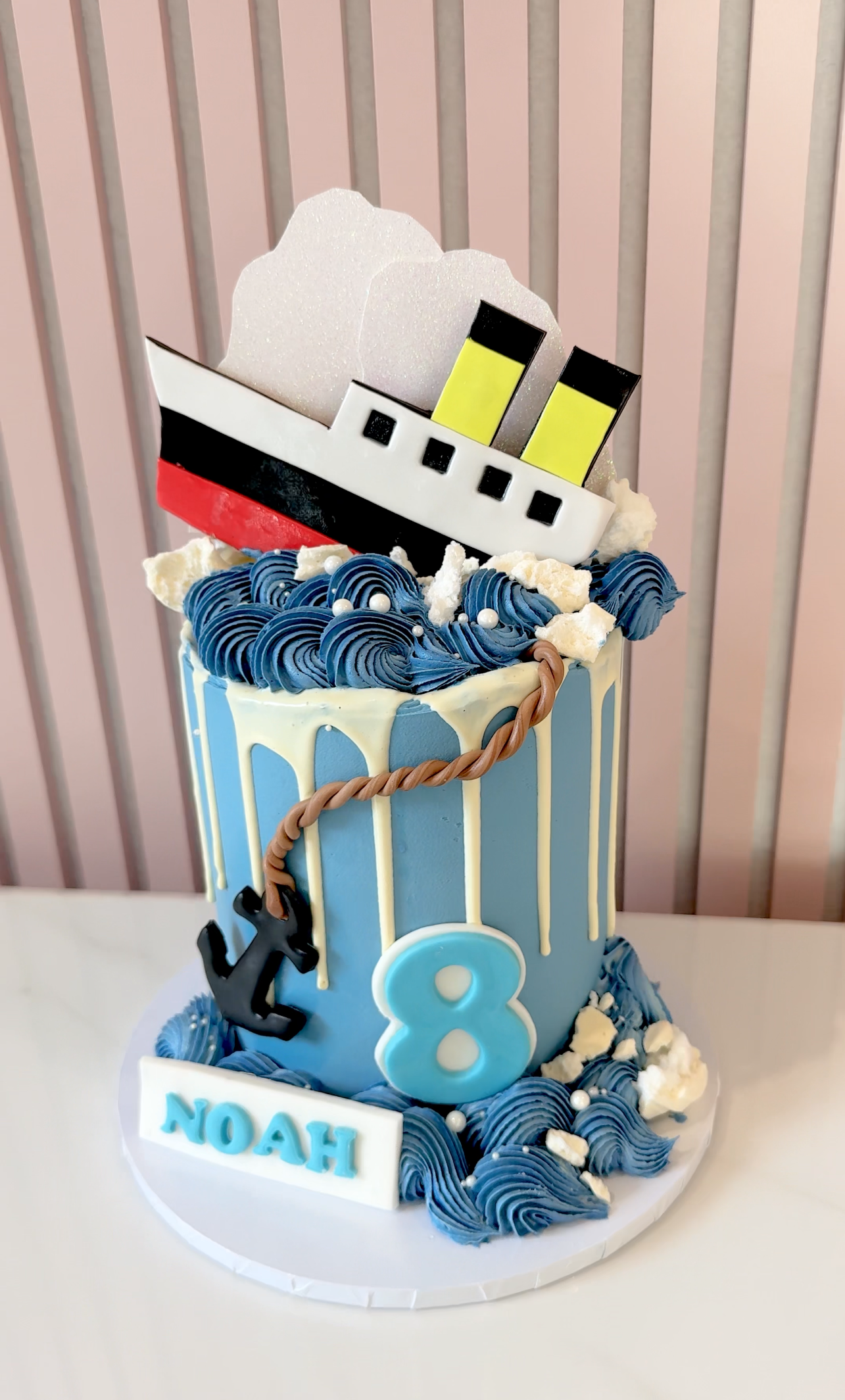 Make waves at your next celebration with this striking Titanic-inspired birthday cake. Designed to look like the iconic ship mid-sink, it features dramatic buttercream waves and scattered icebergs. Finished with a twisted fondant rope, anchor detail, and soft white chocolate drip, this blue and white design is perfect for any little adventurer with a love for the sea.