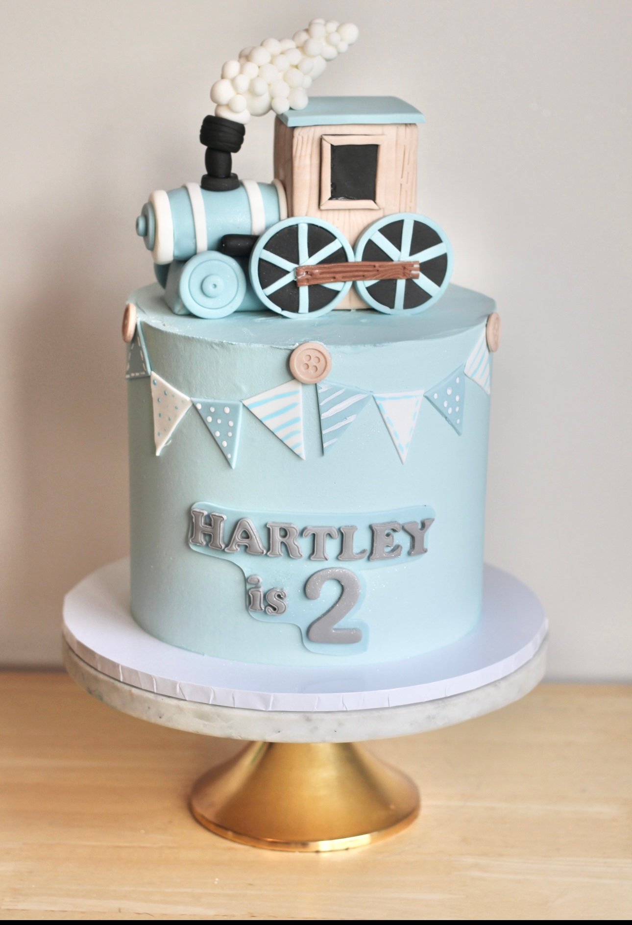 All aboard for a delightful birthday celebration with this charming Train Cake! Designed in soft pastel blue tones, this cake features a beautifully crafted fondant steam train on top, complete with intricate details like wooden-style panels, wheels, and a billowing puff of icing smoke. A bunting-style decoration wraps around the cake, adding to its nostalgic appeal, while button embellishments complete the vintage look. Perfect for little train lovers, this cake can be customised to suit any age or colour scheme.
