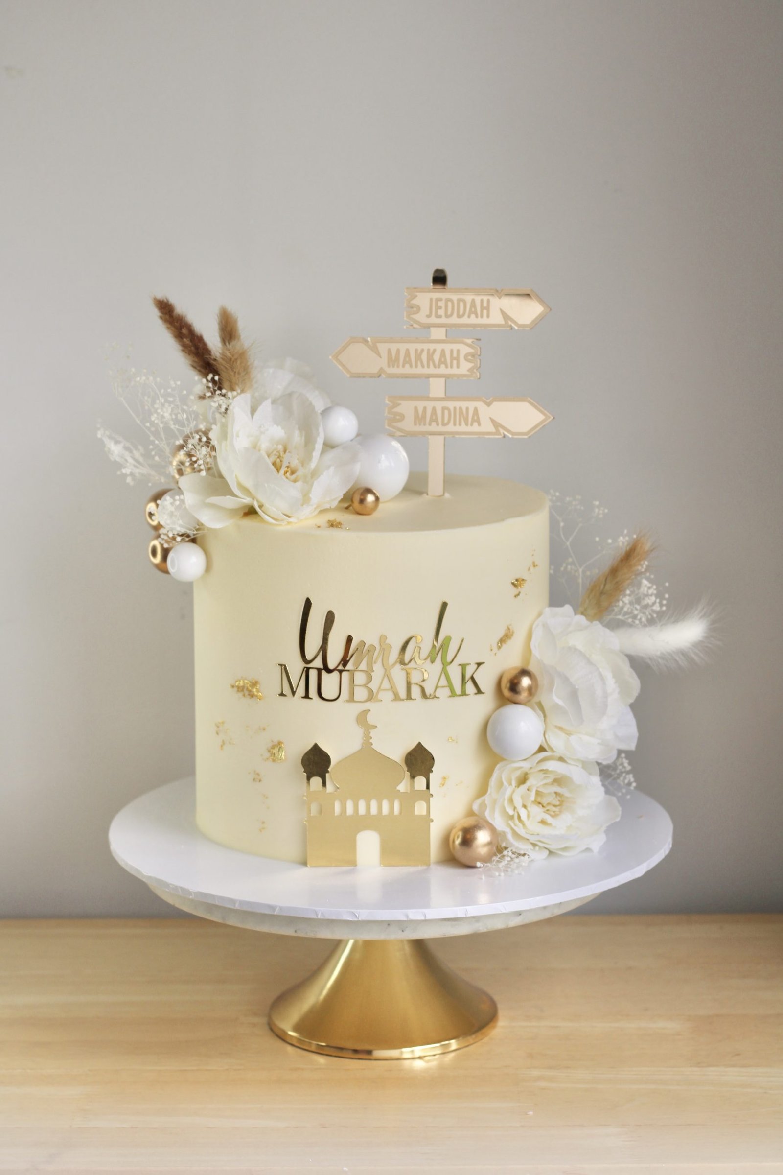Mark the blessed occasion of Umrah with this beautifully designed cake, featuring an elegant ivory base adorned with gold accents and delicate floral arrangements. A mosque-inspired embellishment, alongside a stunning “Umrah Mubarak” topper, adds a meaningful touch. The signpost detail pointing to Jeddah, Makkah, and Madina makes this cake even more special. Perfect for celebrating a loved one’s spiritual journey in a truly elegant way.