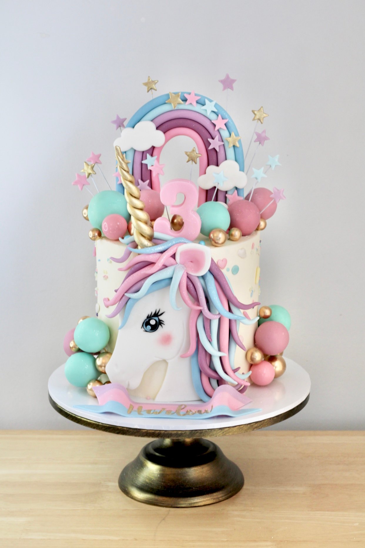 Bring a touch of magic to any birthday with this dreamy unicorn-themed cake. Featuring a beautifully sculpted unicorn with a flowing pastel mane, a golden horn, and a vibrant rainbow backdrop, this enchanting design is perfect for any unicorn lover. Decorative spheres and sparkling stars add an extra whimsical touch to this delightful celebration cake.