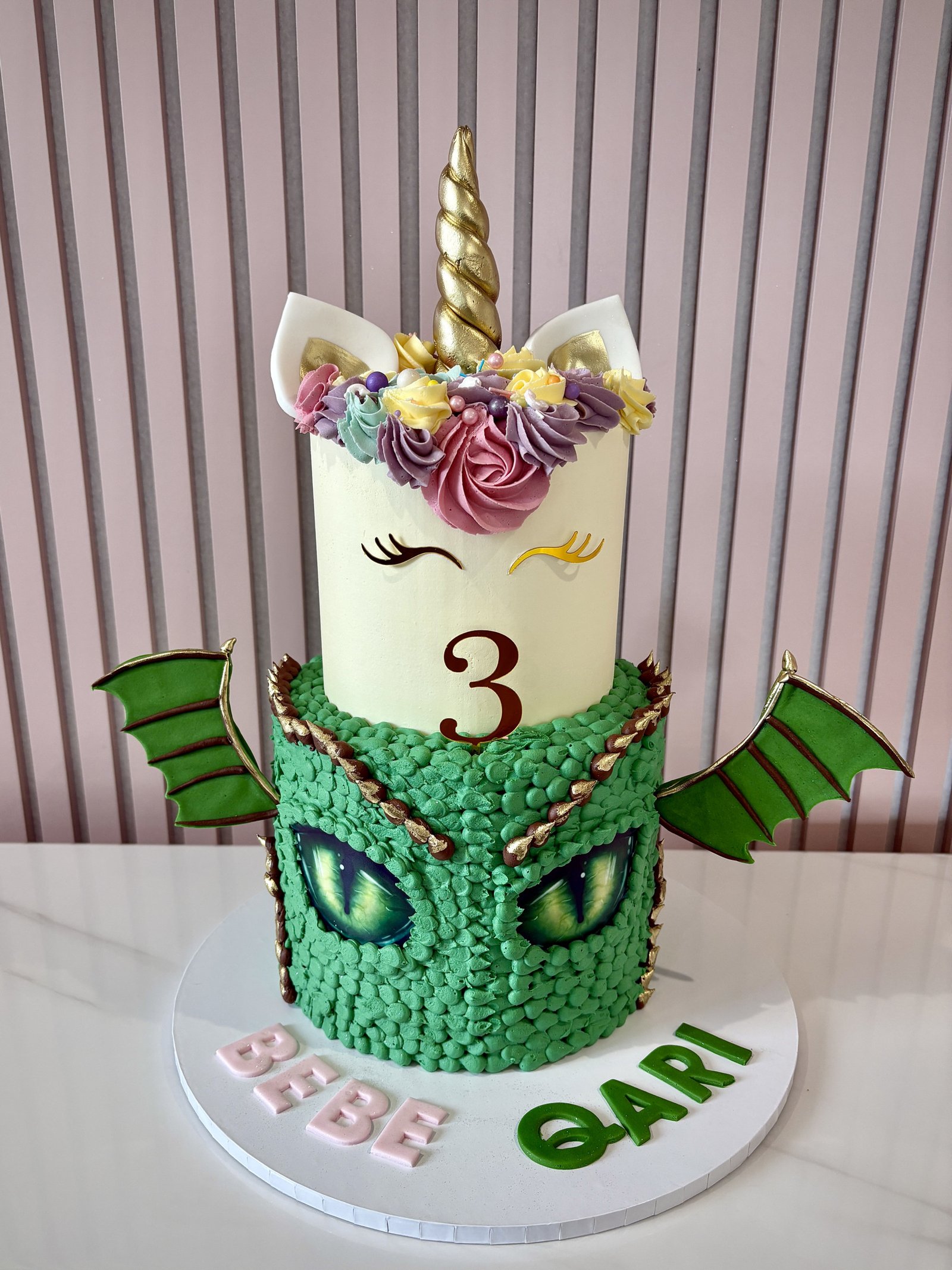 A magical two-tier birthday cake combining the worlds of unicorns and dragons for a truly imaginative celebration. The top tier features a sweet unicorn design with a gold horn, delicate ears, colourful buttercream swirls and elegant eyelash details. Beneath, the lower tier transforms into a striking dragon with textured green scales, dramatic dragon eyes and bold wings extending from the sides of the cake. This playful design brings together fantasy and adventure, making it a wonderful centrepiece for children who love magical creatures and fairytale themes.