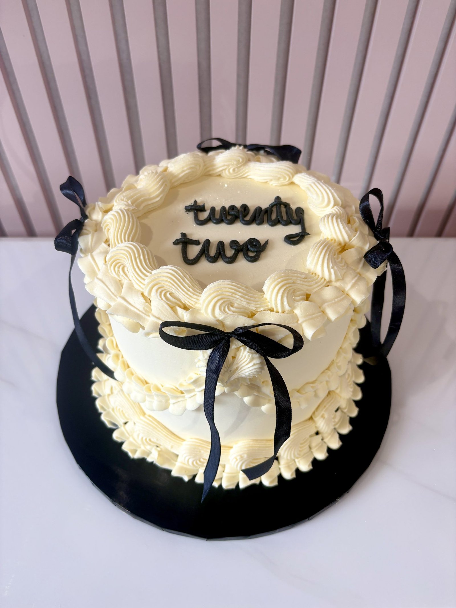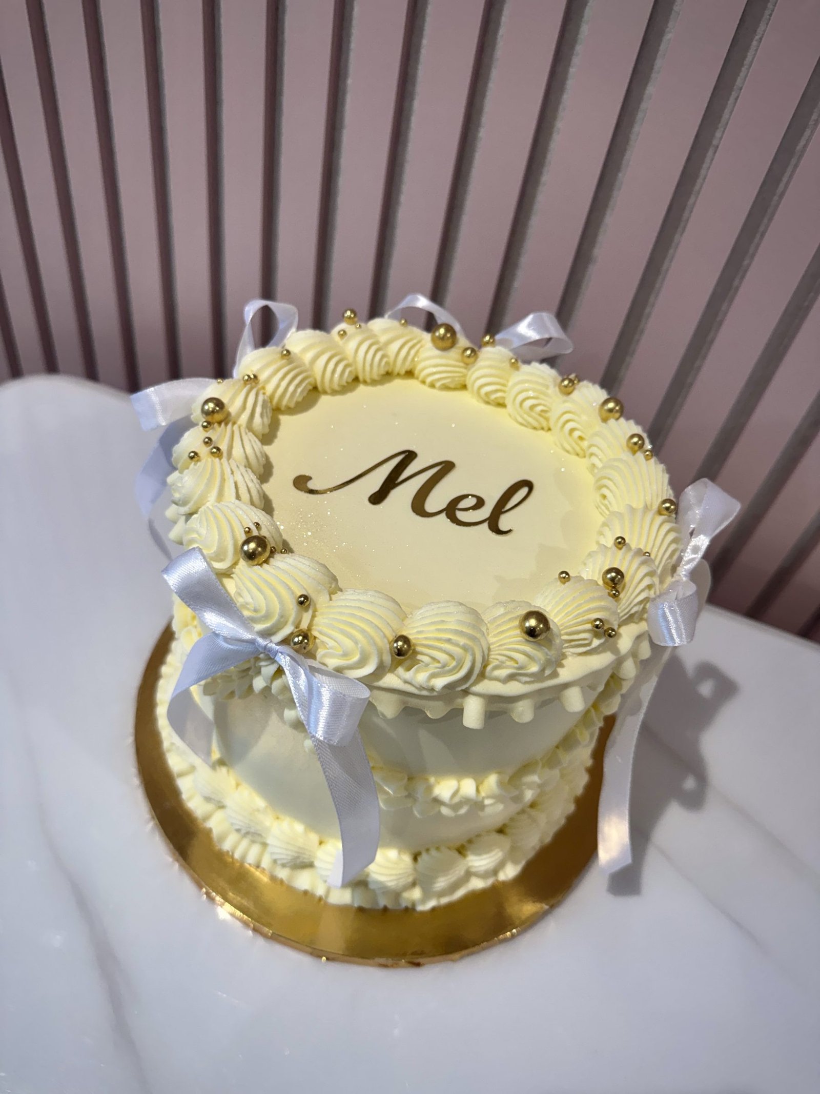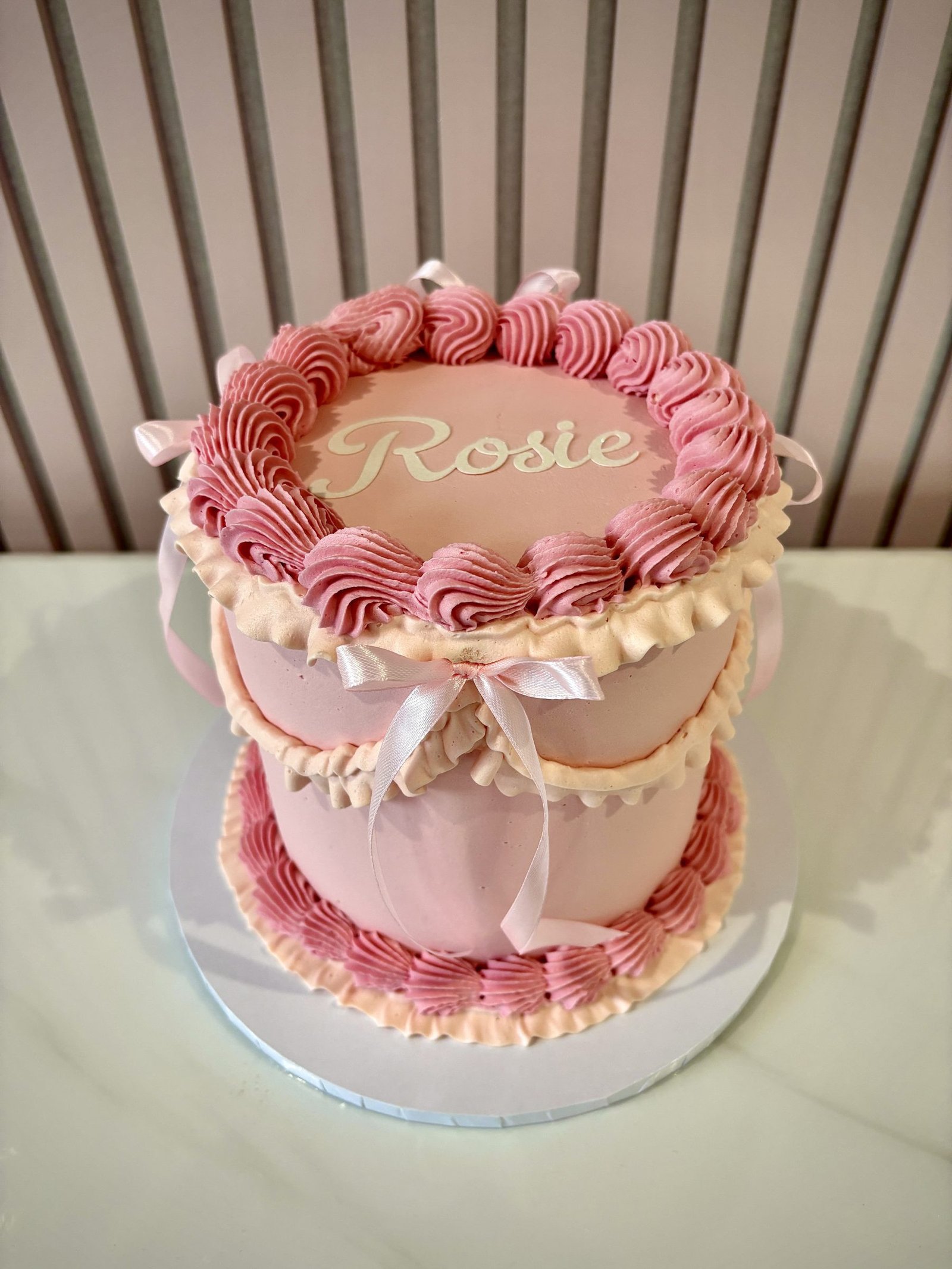 Our Vintage Lambeth Round Cake is inspired by classic celebration cake artistry, featuring beautifully piped buttercream ruffles, swags and borders in the timeless Lambeth style. Elegant detailing, delicate textures and carefully balanced piping create a refined centrepiece, perfect for birthdays and special occasions. The cakes shown in the gallery illustrate just some of the many colour palettes and decorative styles available. Each cake is made to order and can be fully customised to suit your celebration. After placing your order, simply include your preferred colours and message in the order notes. If there is a particular design from the gallery you would like us to recreate, or if you have a reference image you would like us to follow, you are welcome to email it to us after ordering and we will tailor the cake accordingly. Every cake is individually piped by hand, meaning each one is unique while staying true to the elegant vintage Lambeth style.