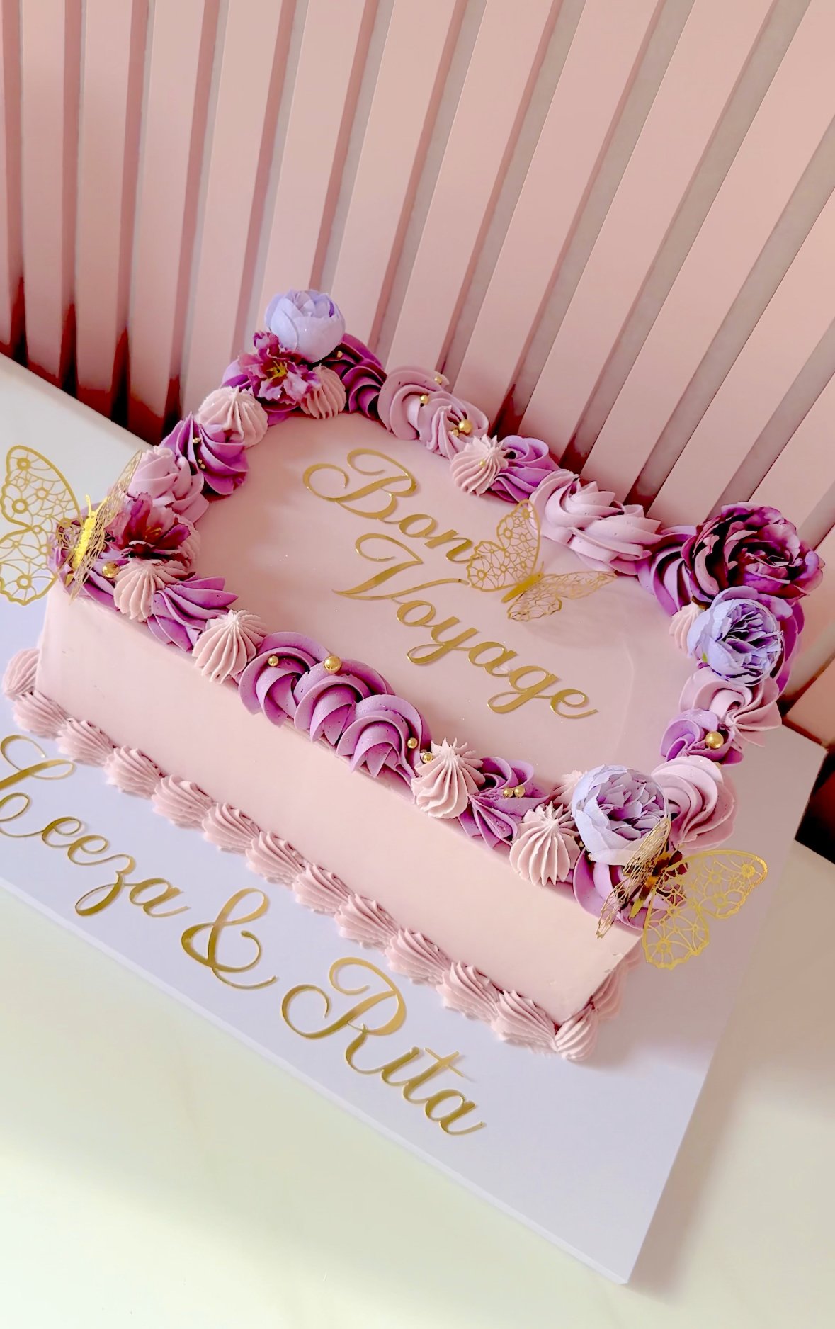 Our vintage-style sheet cake is a beautiful throwback with a modern twist. Decorated with soft pastel swirls, piped rosettes, and elegant butterflies, it’s perfect for birthdays, baby showers, or any special occasion. This rectangular design is fully customisable to suit your colour theme and celebration style.