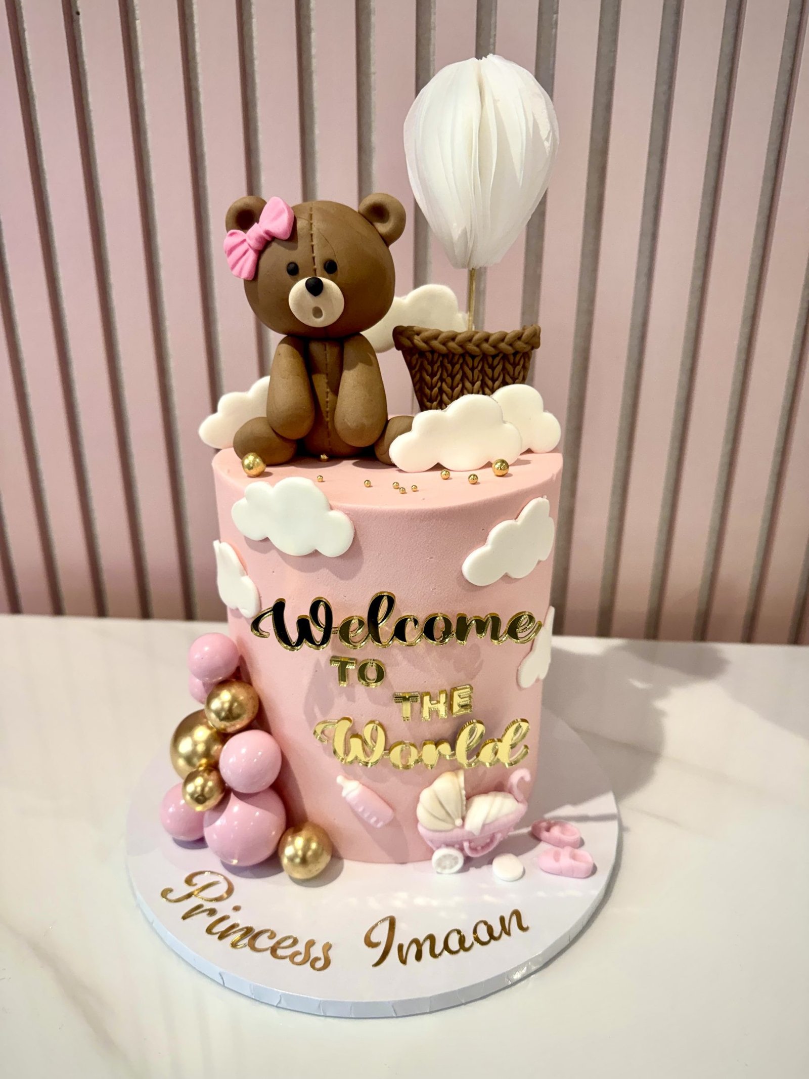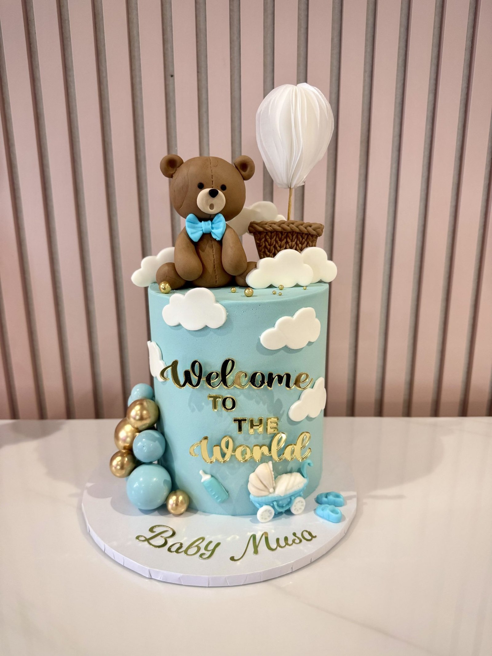 This beautifully crafted Welcome to the World cake is designed to celebrate the arrival of a new-born in the most gentle and heartfelt way. Featuring a soft pastel finish, floating cloud details, and an adorable handcrafted teddy bear topper alongside a hot air balloon, the design captures the magic of those first precious moments. Calm, timeless, and full of warmth, this cake makes a meaningful centrepiece for welcoming a new baby into the world.