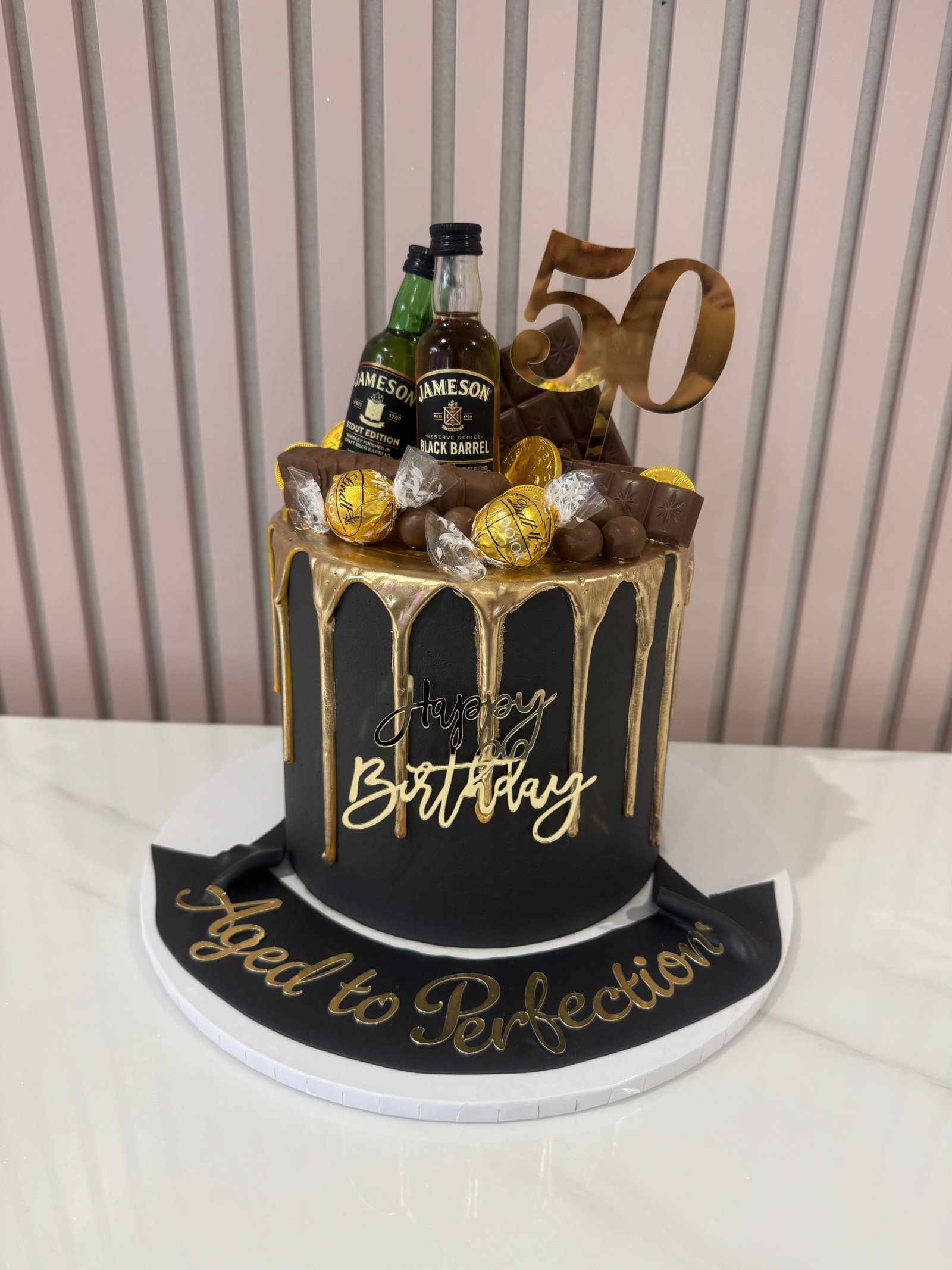 A bold and indulgent whisky-inspired cake designed for sophisticated milestone celebrations. Finished in smooth black buttercream with dramatic metallic gold drip detailing, this tall design delivers instant impact. The top is styled with miniature whisky bottles, premium chocolate bars, truffles and gold-wrapped chocolates, creating a rich and luxurious arrangement. Gold accents and a personalised age topper elevate the look, while the clean cylindrical finish keeps the overall aesthetic refined and modern. Perfect for 40th, 50th and landmark birthdays, this cake blends statement styling with elegant detailing. Fully customised with any name, age or preferred spirit to suit the occasion.