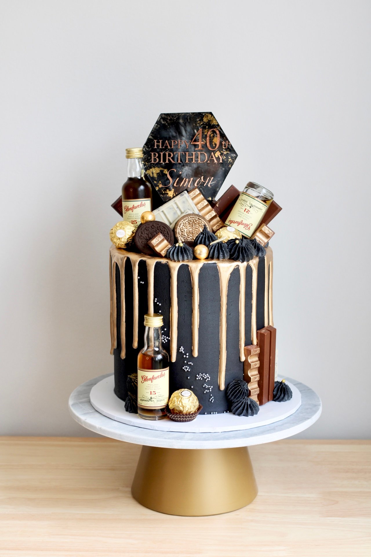 Celebrate in style with this luxurious whisky and chocolate drip cake. Coated in rich black buttercream with elegant gold drips, it’s adorned with premium treats like Ferrero Rocher (contains nuts), KitKat, and mini whisky bottles. A custom hexagonal plaque adds a personal touch—ideal for milestone birthdays and special occasions. This show-stopping cake combines sophistication with indulgence, making it the perfect gift for the whisky enthusiast in your life.